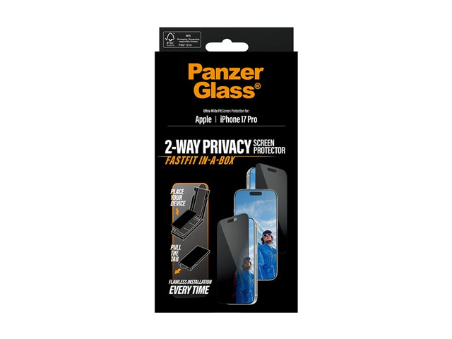 Produktbeskrivning PanzerGlass Privacy - skärmskydd för mobiltelefon - ultra-bred passform med FASTFIT IN-A-BOX Typ av produkt Skärmskydd - glas - med sekretessfilter Avsedd för Mobiltelefon Skydd Droppskydd, reptålig, motstår fingeravtryck, stötsäkert, fläcktålig, fettskydd Beläggning Oleofob Förpacknings innehåll Skärmskydd, Fastfit Produktmaterial Allerglas (mikrofraktur2023), silikon, PET (Polyethylene Terephthalate) Dimensioner (BxDxH) 6.764 cm 14.575 cm Grovlek 0.75 mm Vikt 20 g Designat för Apple iPhone 17 Pro - Nedladdningsbara filer